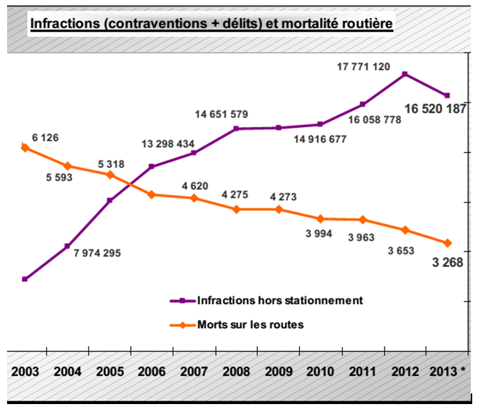 Depuis dix ans, on nous expliquait doctement que c’était grâce aux radars et à la répression massive. Depuis que la Sécurité routière a été déclarée « grande priorité nationale » en 2002 par Jacques Chirac et que le 1er radar a été installé sur nos route en octobre 2003, le nombre d’infractions a explosé, passant de 5,5 millions par an (hors stationnement) à 17,8 millions en 2012.