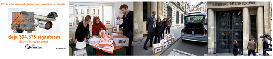 PV « à la volée » et vidéo-verbalisation sur tout le territoire, destinées à nous sanctionner en rafale : la résistance s’organise ! En quelques semaines, déjà plus de 300 000 Français se sont engagés aux côtés de la Ligue de Défense des Conducteurs en signant notre pétition « Non aux nouvelles mesures répressives ». Jeudi 20 novembre, notre délégation est allée déposer 304.675 signatures au ministère de l’Intérieur.